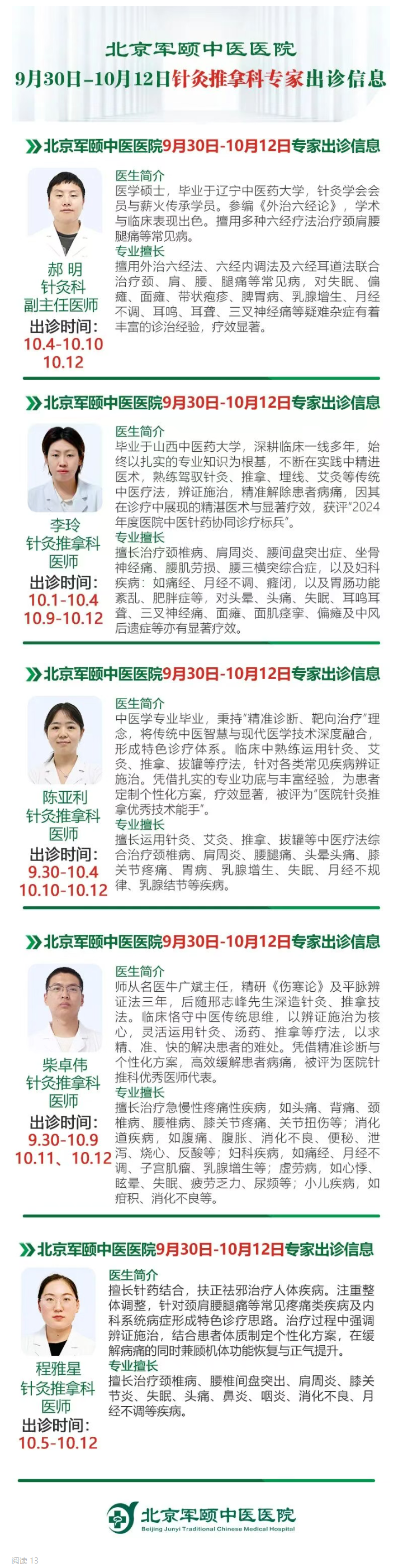 “双节”我在岗,健康不打烊!9月30日-10月12日号针推科专家排班表公布→